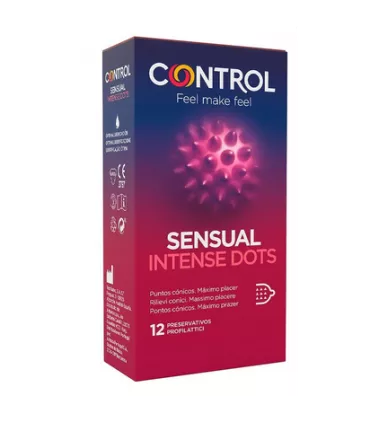 - Control Sensual Intense Dots es un preservativo que proporciona un placer extra gracias a sus puntos cónicos distribuidos por la superficie del mismo
