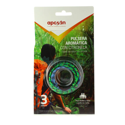 Pulsera Aromática con Citronela Aposan es útil para toda la familia. Para niños a partir de 3 años. Se coloca en las muñecas o los tobillos. Es resistente al agua. Ideal para las actividades al aire libre. Hay 3 pulseras y cada una de ellas sirve para unos 7 a 10 días aproximadamente fuera de la caja. Hay para su utilización durante 1 mes. Guardar la pulsera que no vaya a ser utilizada en el envasecon autocierre para preservar su aroma.