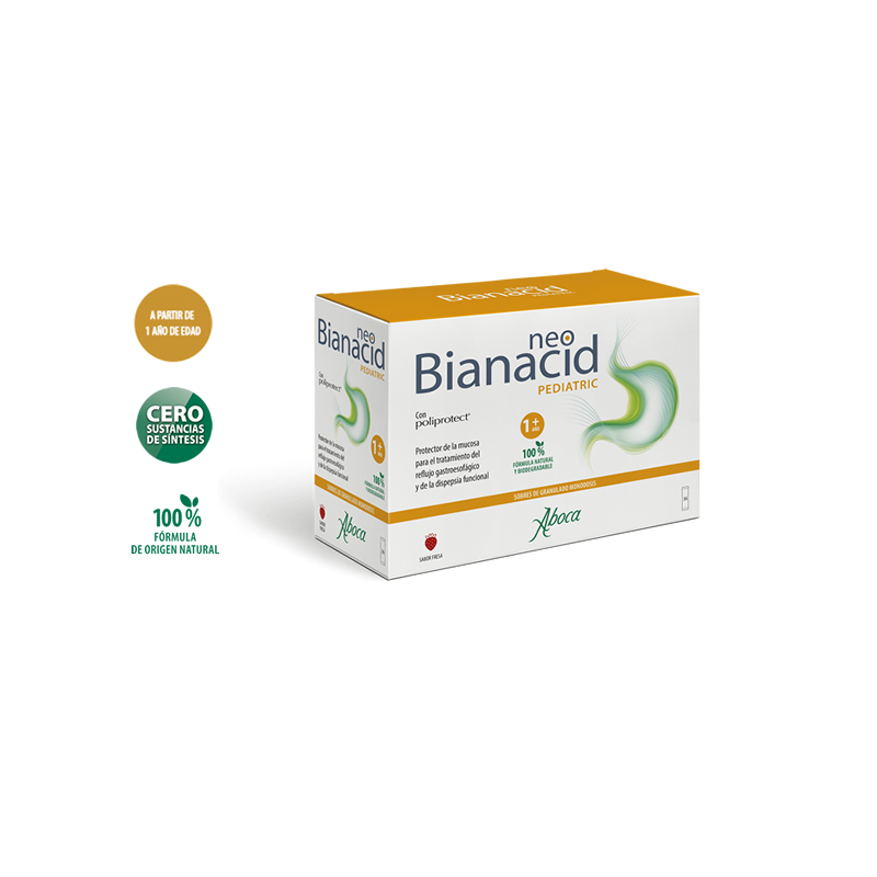 NeoBianacid Pediatric es un producto a base de complejos moleculares vegetales y minerales, que ejerce una acción protectora y en consecuencia lenitiva de la mucosa gastroesofágica útil para contrarrestar rápidamente la sensación de acidez, el ardor y el dolor, es decir, los síntomas típicos de la irritación y la inflamación de esta misma mucosa.