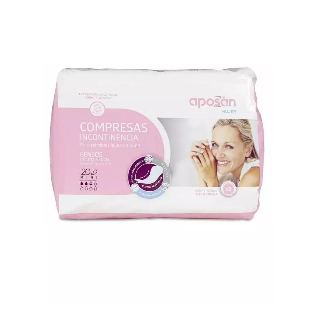 Aposan Compresa Incontinencia Mini 20 Unidades, se trata de unas compresas íntimas para la incontinencia. No contienen látex y están testadas dermatológicamente.