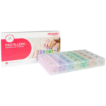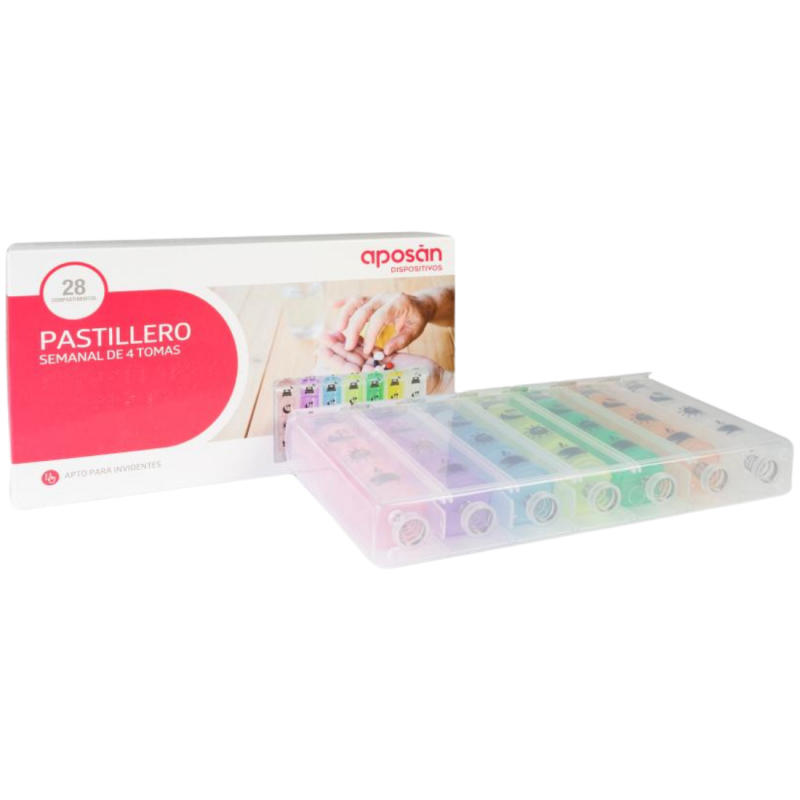 Pastillero con un total de 28 compartimentos, divididos en cada día de la semana con 4 tomas (desayuno, comida, cena y antes de dormir) cada uno. Cada día tiene un color diferente. Portátil, compacto y ligero. Apto para invidentes