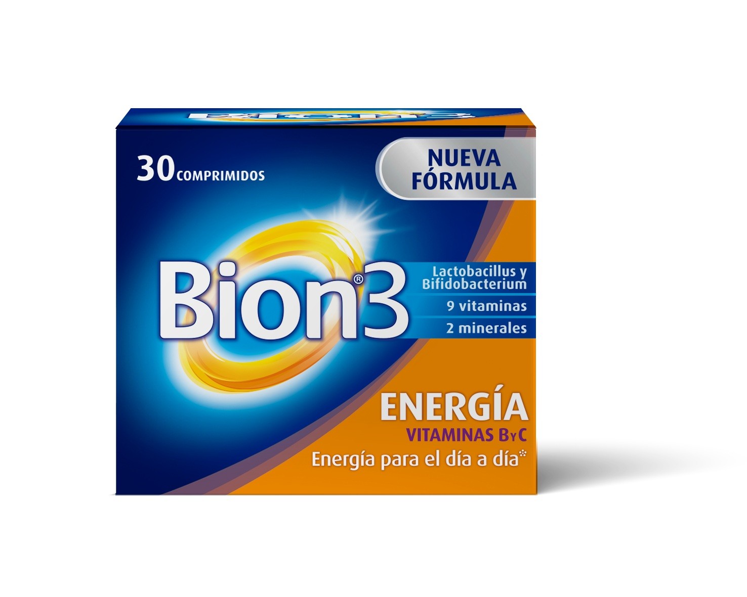 Bion3 energía contiene 9 vitaminas, incluyendo las vitaminas B12 que contribuyen al metabolismo energético normal, 2 minerales, incluyendo el hierro que ayuda a disminuir la fatiga, y ginseng y 3 cultivos Tri-Bion, que llegan a la microbiota intestinal gracias a un recubrimiento que los protege de la acidez gástrica.