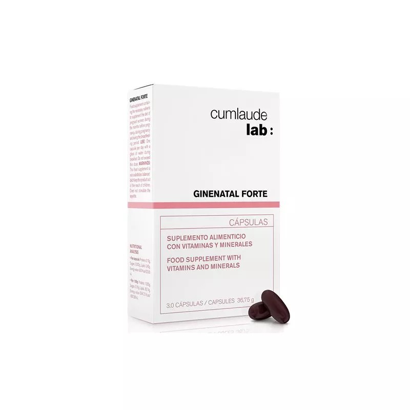 Suplemento alimenticio con vitaminas y minerales, que aporta todos los nutrientes necesarios en la dieta de mujeres embarazadas. Durante el embarazo y en el periodo de lactancia. Cumlaude Lab Ginenatal Forte 30 cápsulas es un complemento alimenticio que contiene nutrientes esenciales cuando se planifica la gestación. Este contiene ácido fólico para prevenir defectos en el tubo neural del feto, vitamina B12 para la formación de glóbulos rojos y el mantenimiento del sistema nervioso, yodo para el desarrollo nervioso del feto, vitamina B6 para el estado anímico general y ácidos grasos omega 3 para aportar energía.