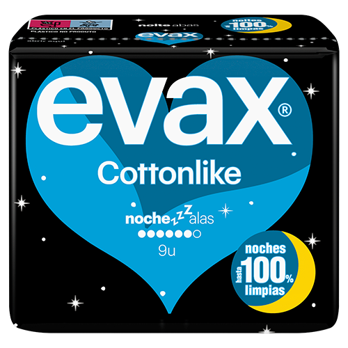 Las compresas Evax Cottonlike Noche están diseñadas para ofrecerte la protección que necesitas por la noche y así ayudarte a dormir mejor. Son más anchas atrás* para una mayor cobertura allí donde más la necesitas, sea cual sea tu postura al dormir. El Sistema Evax Cottonlike Dual incorpora unas perlas activas que neutralizan el olor y su núcleo superabsorbente captura el flujo menstrual al instante.