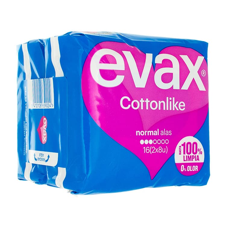 Evax Cottonlike Normal con Alas gracias a su Sistema Evax Cottonlike Dual con perlas activas que neutralizan el olor y un núcleo que captura el flujo al momento, Sus alas fijan la compresa en su sitio y la cobertura Cottonlike te ofrece suavidad y un confort duradero. Dermatologicamente testada para la piel delicada.