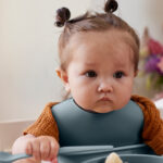 El diseño de sus laterales permite canalizar el líquido y los restos de comida hacia su gran depósito, logrando con ello que el bebé se manche menos.