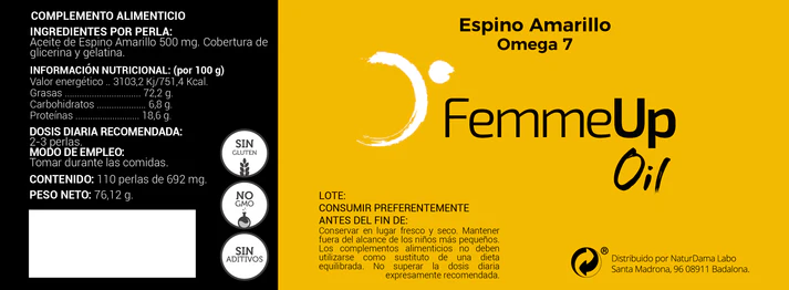 FemmeUp Oil es un complemento alimenticio natural para la mejora de la piel y las mucosas, a base de espino amarillo 100% natural que favorece la lubricación.