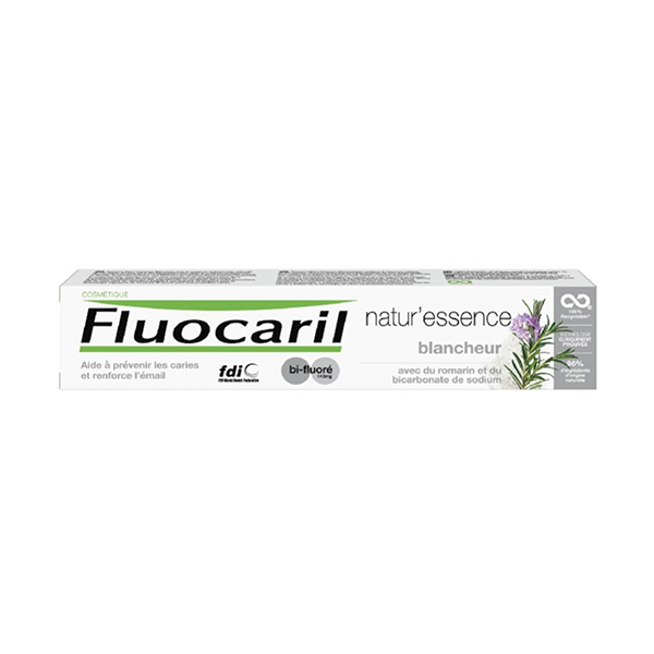 Fluocaril Natur’essence Bi-fluoré 145 mg Blanqueante es una pasta dental diseñada para restablecer el blanco natural de los dientes. Cuenta con un 96% de ingredientes de origen natural. No ayuda solamente a aclarar el tono del esmalte, sino que también lo protege frente a los ácidos gracias al bicarbonato sódico y al aceite de romero.