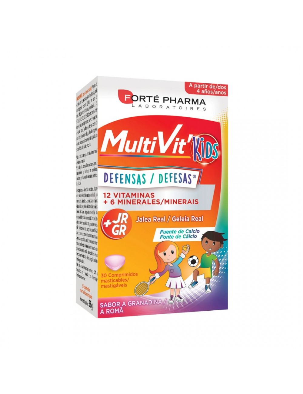 Multivit Kids Defensas 30 Comprimidos Masticables. Este complemento alimenticio para niños ayuda a fortalecer las defensas de los niños. Elaborado con Jalea Real, Fuente de calcio, 6 minerales y 13 vitaminas.