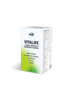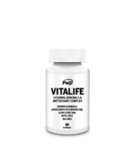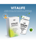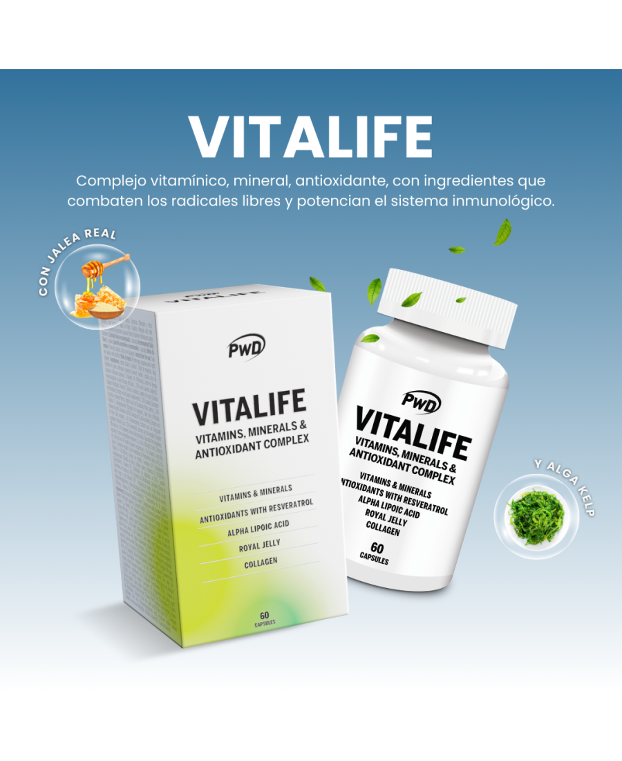 Vitalife es un complemento vitamínico mineral, con vitaminas antioxidantes, principios activos anti edad y radicales libres. Todos juntos, en la combinación ideal, constituyen una eficaz fórmula de alto rendimiento.Sus características especiales son fuente de Vitamina A combinada con un muy reforzado complejo de Vitaminas B al completo, las cuales hacen de este complemento vitamínico un producto adaptado para el estrés de la vida actual, es un perfecto aliado para la recuperación del esfuerzo físico y del sistema nervioso sensorial y motor. Este producto posee los principales minerales para garantizar un correcto aporte de ellos ante un desgaste elevado y contribuye también a reforzar el sistema inmunológico. Como es el caso del Selenio, que aparte de ayudar a eliminar los radicales libres mantiene en buena salud la glándula tiroides. El Cobre es un mineral que se reduce en los celiacos y es de suma importancia. Contribuye al mantenimiento del sistema vascular y circulatorio, la formación de glóbulos rojos, sistema inmunitario y huesos. Manganeso, esencial para la vida en la tierra de todos los seres vivos, también forma parte de Vitalife, absorbiéndose hasta en el intestino delgado. Como contribución a la metabólisis de las grasas también se encuentra el Cromo, el cual favorece niveles óptimos de insulina en el organismo. El Potasio contribuye en Vitalife a regular la actividad neuromuscular, contracción muscular y el correcto balance en agua mediante el equilibrio osmótico entre las células. Es el máximo responsable en el mantenimiento del líquido intracelular (fluido intersticial). El complemento también contiene vitaminas antioxidantes de alta potencia, como es el caso de la Luteína, la cual se encuentra en la mácula ocular, potente antioxidante en beneficio del ojo y la vista en la prevención de cataratas. Un eficaz principio activo también antienvejecimiento es el Ácido Alfa Lipóico el cual favorece la formación de insulina, esta regula la cantidad de azúcar en sangre. Hay que recordar que la insulina es también conocida como la hormona transportadora, así que con una dieta baja en carbohidratos es capaz de transportar los nutrientes necesarios a las células de cuerpo humano. El más relevante de los antioxidantes también forma parte de Vitalife, este es el Resveratrol, muy importante para la supervivencia celular, reduce el daño de los radicales libres, mantiene altos niveles de dopamina, antinflamatorio, antienvejecimiento, baja la glucosa en sangre, antifibrótico, mejora la capacidad física en deportistas y la movilidad en personas mayores.Tomar 2 cápsulas al día con el desayuno.Los complementos alimenticios no deben utilizarse como sustitutos de una dieta variada y equilibrada y por un modo de vida sano. No superar la dosis diaria expresamente recomendada.