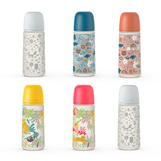 Biberón Prints 360ml, nueva botella, forma recta que ofrece un agarre más cómodo para el bebé. Con tetina Fisiológica SX Pro™ flujo denso, a partir de 6 meses, deja pasar papillas muy líquidas, ideal para bebés mayores o muy comilones.