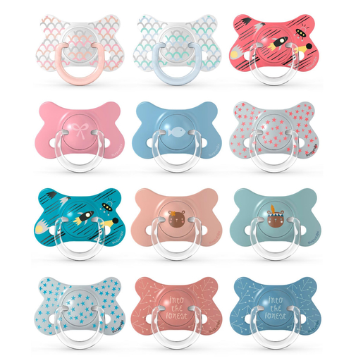 La tetina fisiológica, más estrecha y plana en la base, permite que el chupete quede bien colocado en la boca del bebé, ejerciendo la mínima presión sobre el paladar.