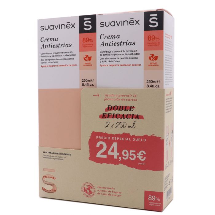 La crema antiestrías Suavinex previene la aparición de estrías aportando a la piel la elasticidad que necesita gracias a la combinación de centella asiática y ácido hialurónico.