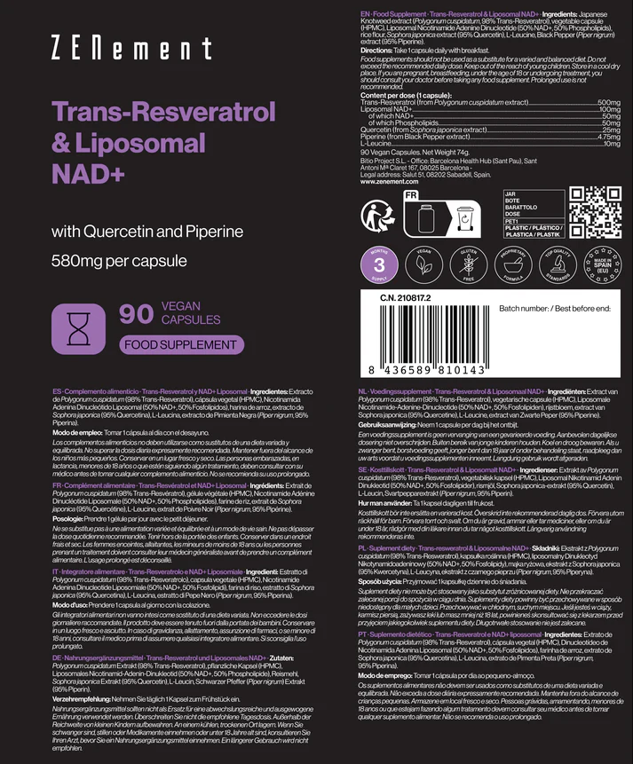 Fórmula Avanzada en Sinergia: Cada cápsula contiene 500 mg de Trans-Resveratrol puro (98%), 100 mg de NAD+ Liposomal, 25 mg de Quercetina y 4,75 mg de Piperina. Esta combinación única de ingredientes trabaja conjuntamente para apoyar la vitalidad celular y promover un envejecimiento saludable.